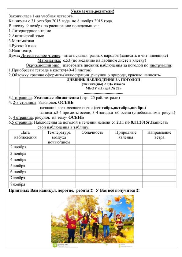 КАНИКУЛЫ С 30 октября по 7 ноября. В ШКОЛУ 8 ноября по расписанию среды.